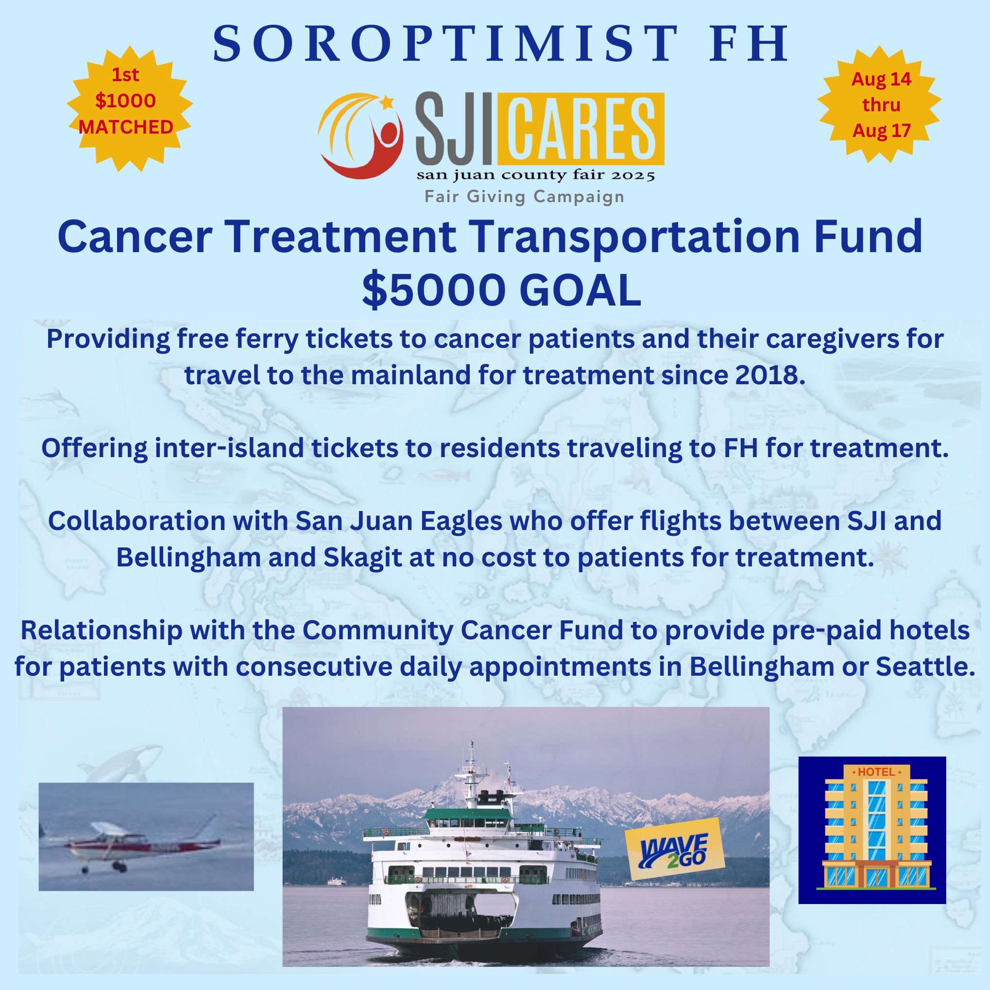 Funds raised will cover increased program costs (based on the last 5-year trend) and allow us to continue to support patients seeking transportation assistance for cancer treatment on the mainland and at PeaceHealth-Friday Harbor from the other San Juan islands at no charge. See SJI Cares button below for details on how to support our campaign during the fair days from August 14 thru August 17. The SJI Community Foundation (SJICF) will match the first $1000 we raise! The SJICF is also awarding $500 per day during the fair to the non-profit organization (NPO) who wins the daily contest. | |